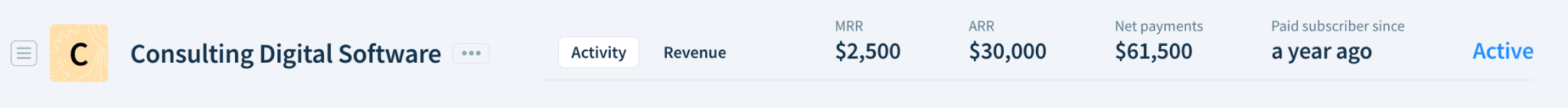 - Customer-level new business/reactivation MRR — When the customer’s MRR grows from zero to a positive value. For example, after purchasing or reactivating a subscription.