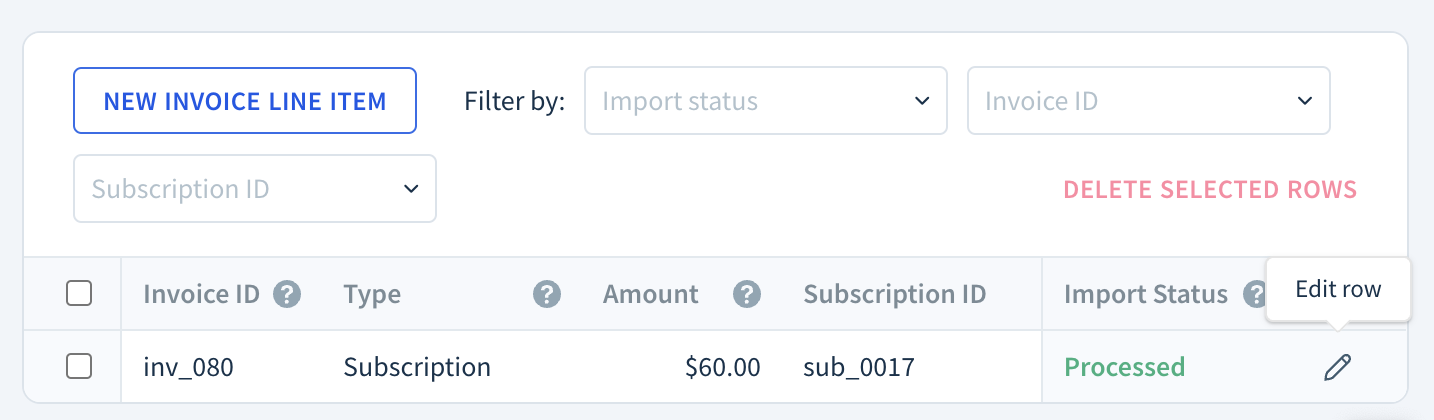 To add an item, click New Invoice, New Invoice Line Item, New Transaction or New Subscription Event in the respective table.