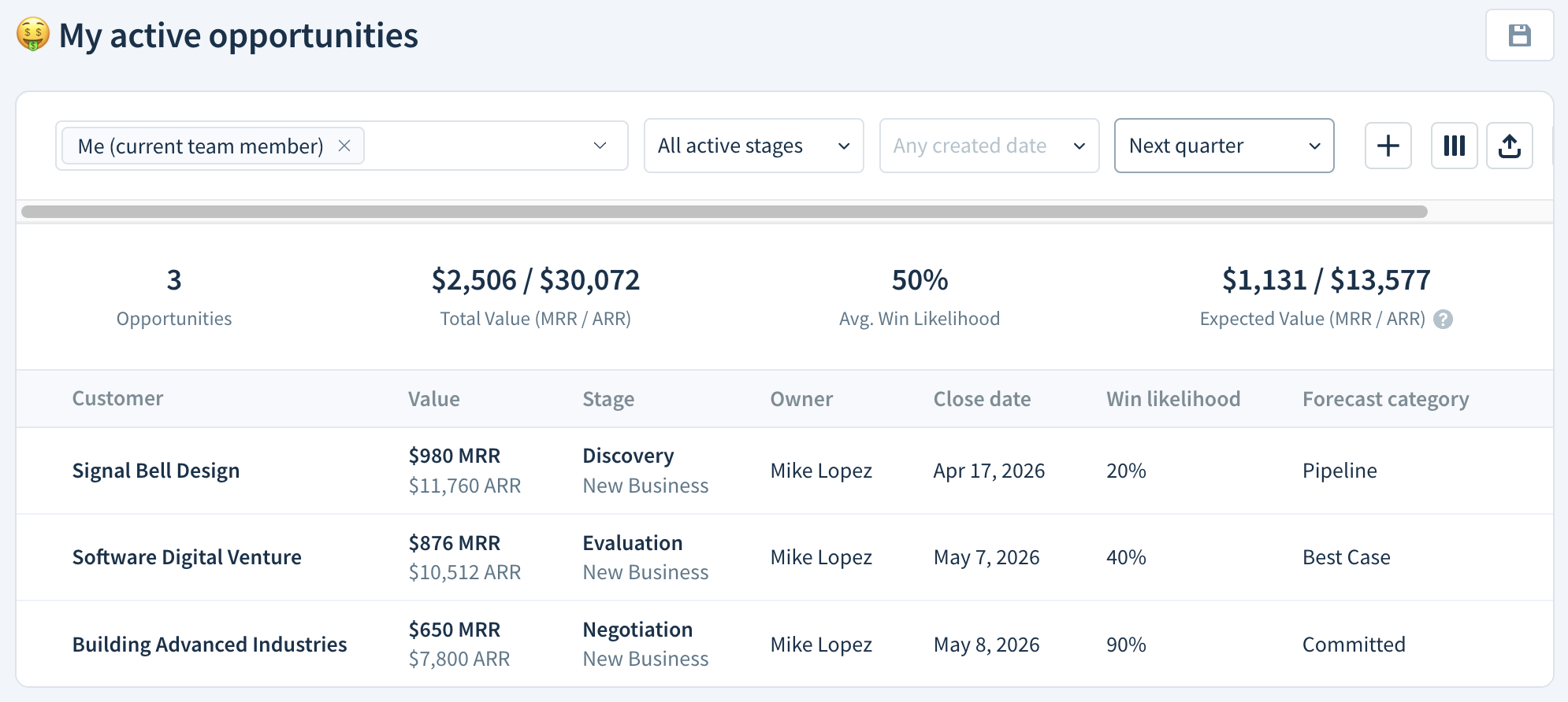 Sales leaders can review All won opportunities to see how much MRR each sales rep brought in during a defined period, useful when calculating commission.