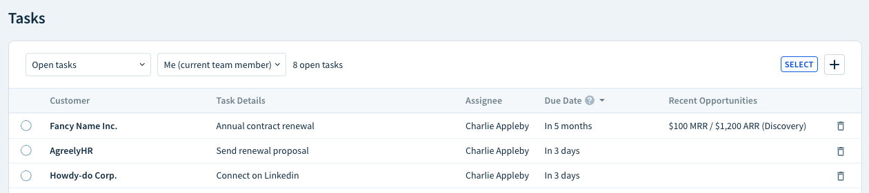 When communicating with many leads at once, use tasks to stay organized. Create tasks for follow-up calls, scheduling product demos, connecting on LinkedIn or sending an email before a trial expires.