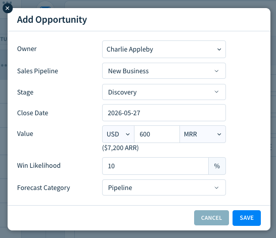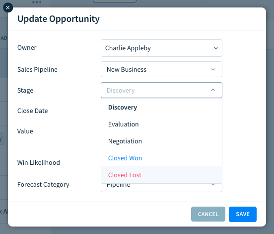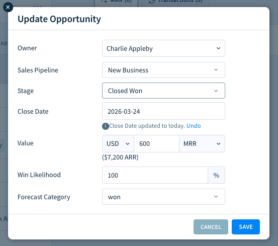 When you’ve completed all the required steps to bill the customer for your product or service, mark the opportunity as Closed Won.
