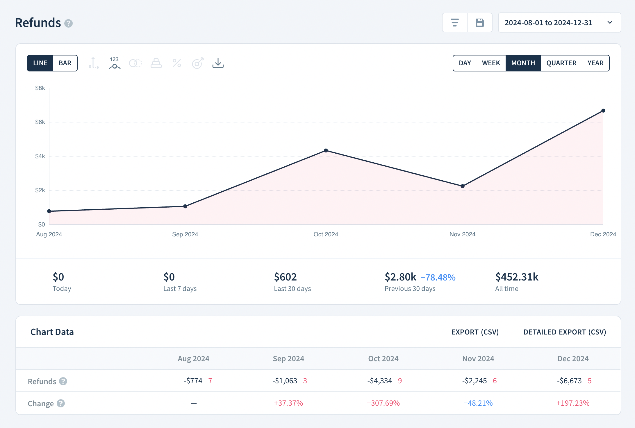 - Change — The increase or decrease in Refunds from the previous report interval, shown as a percentage.